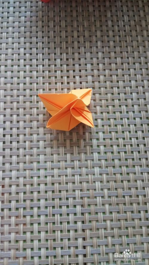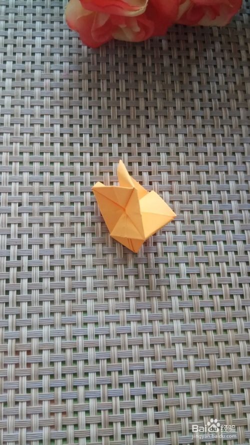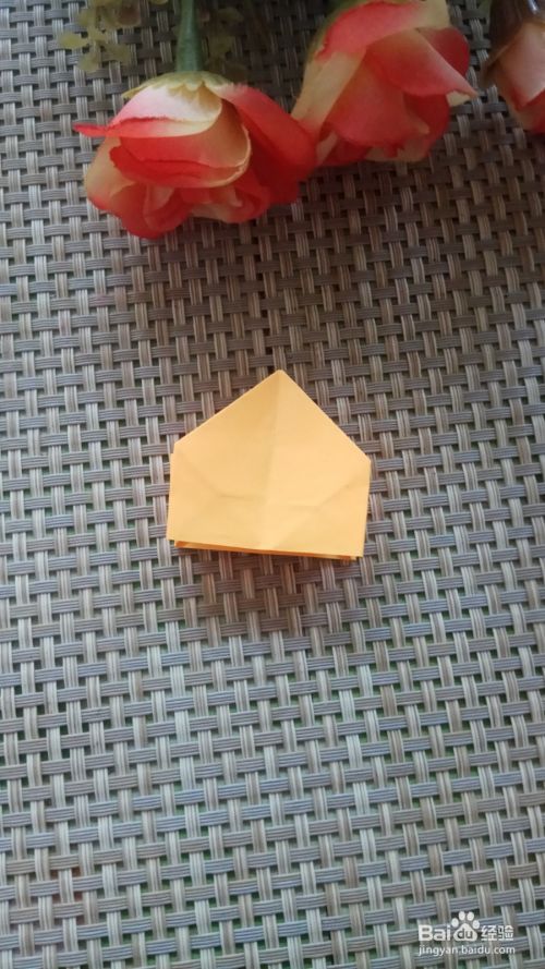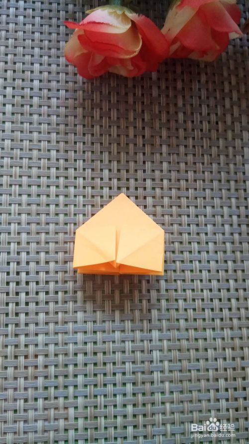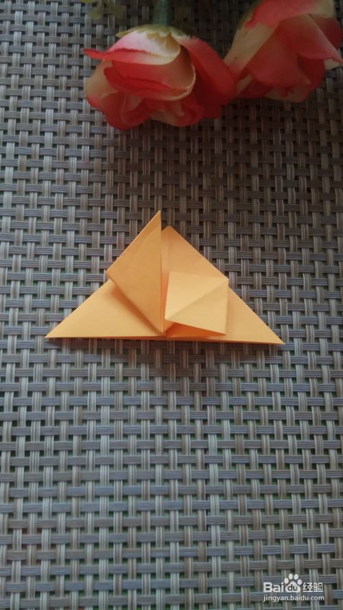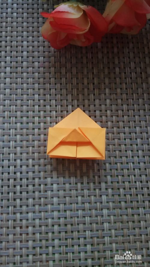 将正方形向上折叠一下,折出两个三角形,中间的三角形向上折叠一下,也折叠出一个三角形,另外一面也按照同样的方法操作一下。