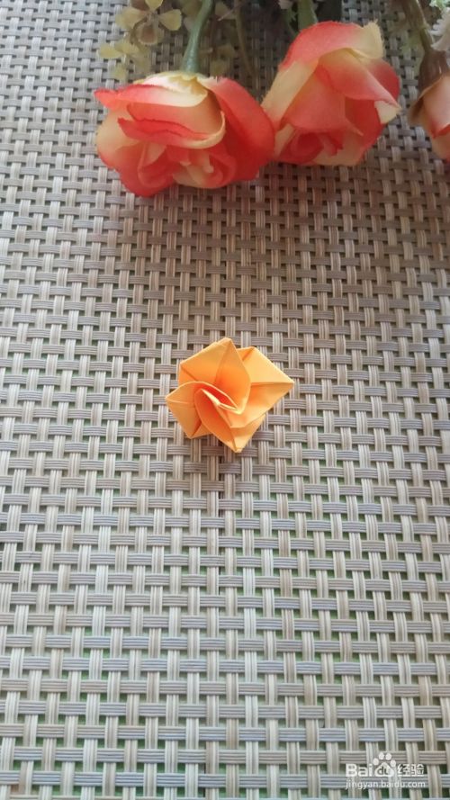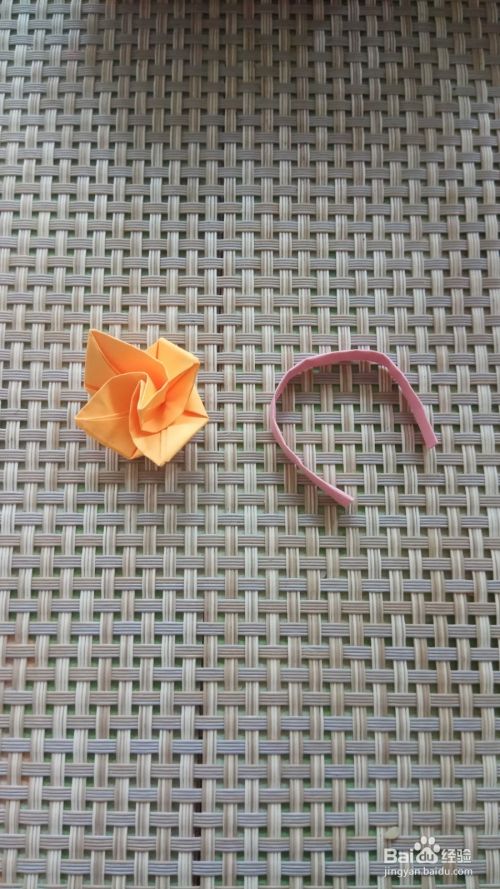 用手轻轻的扭一下,这样更加漂亮,再根据手指的粗细,折出指环,用双面胶和玫瑰花粘在一起,玫瑰花戒指就做好了。