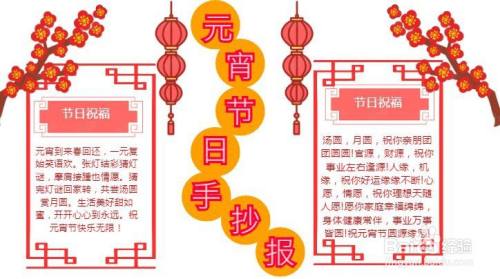 在左边的长方形的边框里面写上:节日的祝福 元宵到来春回还,一元复始笑语欢。张灯结彩猜灯谜,摩肩接踵也情愿。猜完灯谜回家转,共尝汤圆赏月圆。生活美好甜如蜜,开开心心到永远。祝元宵节快乐无限!如下图,