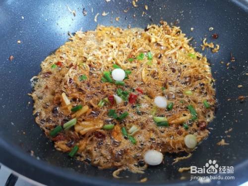 放入炸好的小银鱼,放一勺小葱油,一勺孜然粉,一勺辣椒粉,黑芝麻,盐,糖,翻炒均匀。