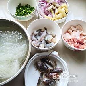 准备好所有的食材,粉丝放泠水泡十分钟左右,虾去头,虾肉去壳去虾线中间划一刀放点料酒白胡椒腌制,猪肉切片。