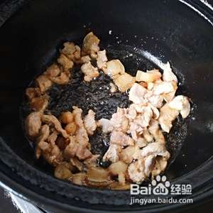 烧热砂锅,炒香猪肉,炒出点猪油。