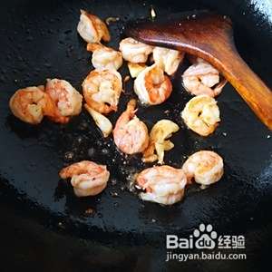 另外一个锅放入油,姜片,蒜,葱头爆香虾肉,大火只要几十秒左右,快速炒一下。