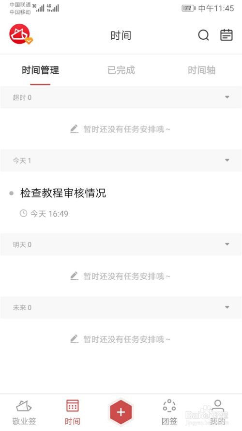 敬业签上面有时间管理列表,安卓手机版打开便签程序后,点击底部下方的“时间”按钮即可进入时间管理列表,时间管理列表用来集中展示便签中设有时间提醒的事件,设置时间提醒的便签将会自动在此列表中进行显示,安卓手机版设置便签时间提醒的方法可参考如下教程。