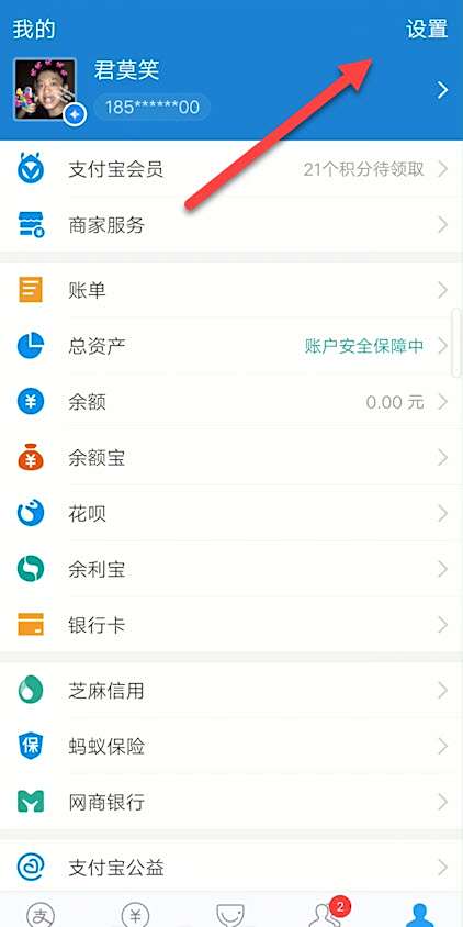点击支付宝右上角的设置。