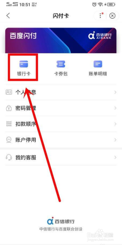 第五步,进入到闪付卡这个页面中之后,在该页面的左上方位置我们找到银行卡这个选项,点击进入。