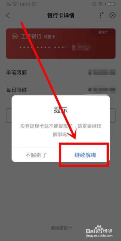第七步,进入到银行卡详情这个页面中之后,在该页面的底部位置我们找到解绑提现卡这个按钮,点击进入。
