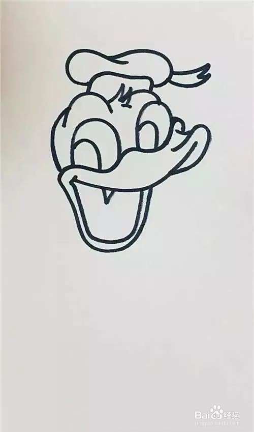 唐老鸭的眉骨有些高,先从高高的眉骨处入手。然后在眉骨见将他特有的“发型”加上去。最后在靠近我们的那个眉骨处连一条曲线,再画一定水手帽