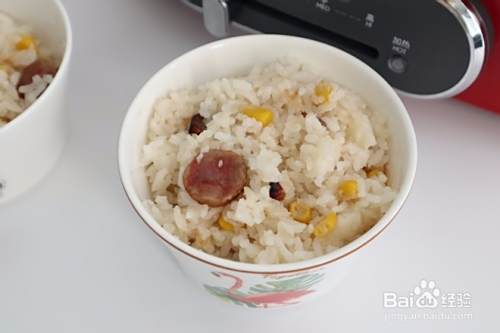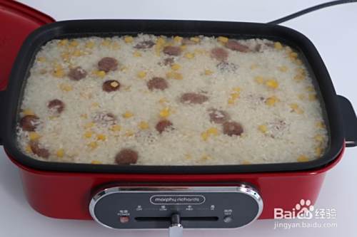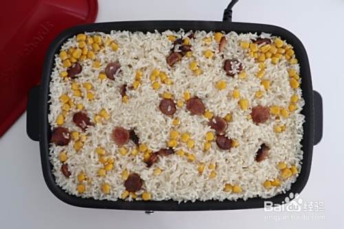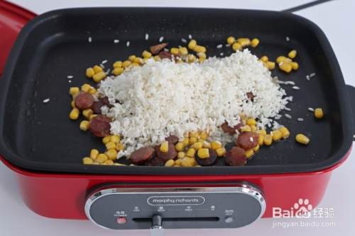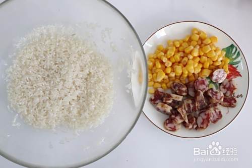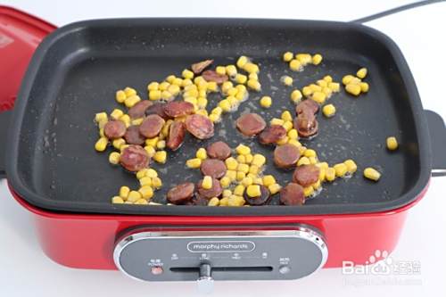 把锅子烧热,接着放入腊肠,炒香。加入玉米粒,翻炒均匀。
