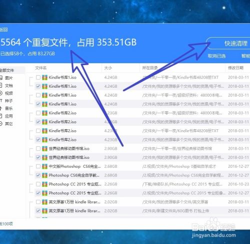 扫描完成之后,就可以看到重复文件的个数,以及所占用的空间,我们点击右上角的快速清理按钮,就可以完成对重复文件的清理了。