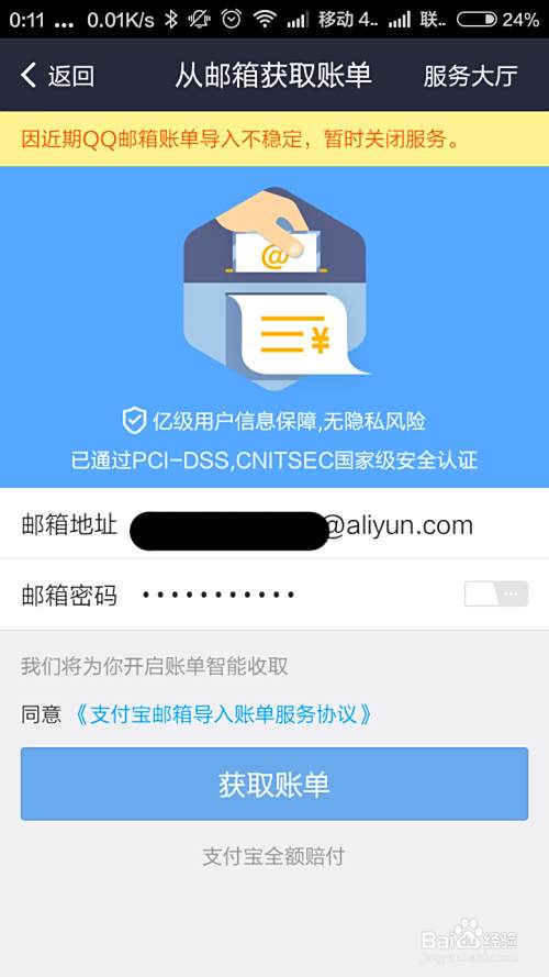 就这个时候出现一个邮箱账单的界面,现在可以把自己的收账单的邮箱资料填进去(个人建议为了安全起见,新申请一个邮箱专门收信用卡的账单),另外支付宝提醒最近QQ邮箱可能会导入账单失败。