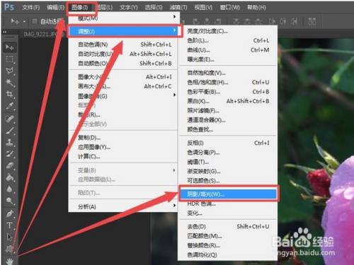在上方菜单区点击图像,选择调整,右滑鼠标,选择“阴影/高光”。