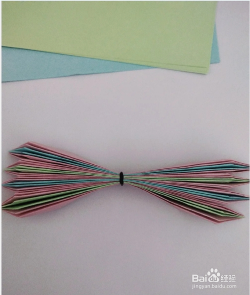 两粉色的和一蓝或一绿的对折纸进行重叠。
