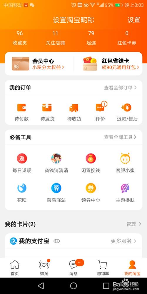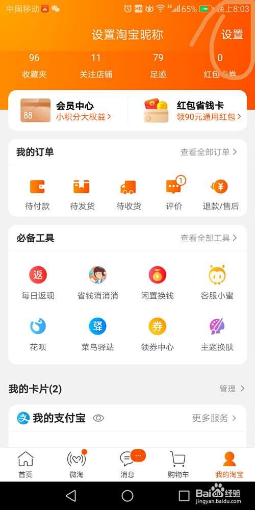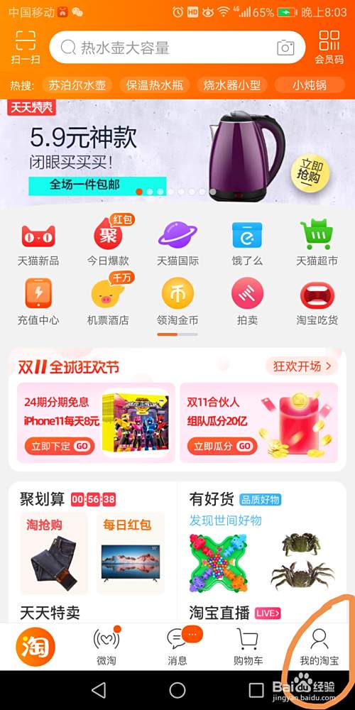 其次是在打开的页面里找到”我的淘宝“点击打开,再打开的页面里找到”设置“的图标点击打开。
