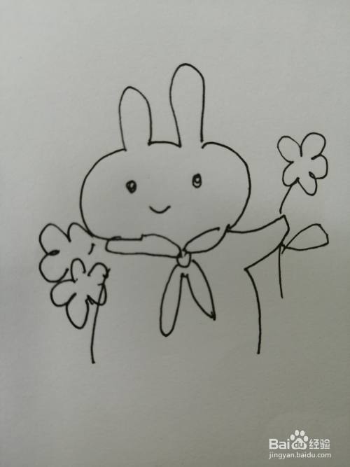 第七步,最后在可爱的小兔子的身体后面画出几朵漂亮的小花。可爱的小兔子就画好了。