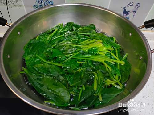 把菠菜洗净后切去根部,锅里加入适量清水,水开后把菠菜下锅焯水,煮30秒左右捞出,用凉水冲凉备用。菠菜中含有一定的草酸含量,所以在和面之前,一定要进行焯水,这样可以有效去除其草酸成分。