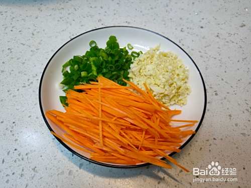 醒面的时候我们准备一下配菜,把胡萝卜洗净去皮切成细丝,小葱切成葱花,大蒜剁成蒜末。