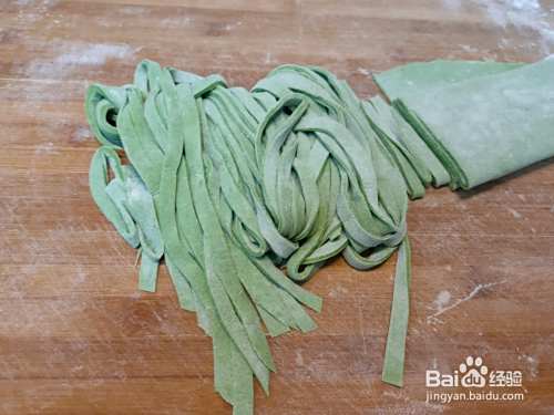面团醒好以后放在案板上,在案板上撒一层干面粉,把面团用擀面杖擀开,擀成薄片后再叠起来,切成1厘米宽度的面条。
