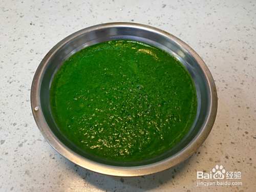 把焯过水的菠菜放入料理机中,再加入适量清水,把菠菜打成细腻的菠菜汁。