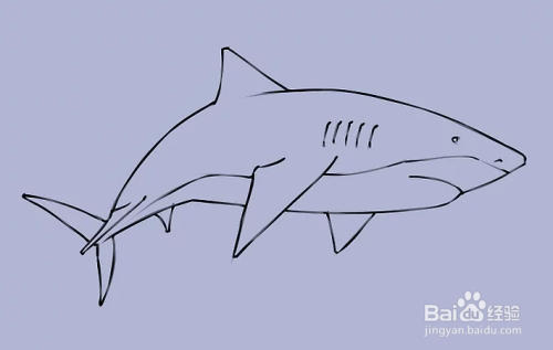在鲨鱼的侧面加上五条线,以弥补它的鳃裂口。将鲨鱼分成前部和后部,通常是因为它的颜色。后部的阴影较深。用倾斜的笔划划过鲨鱼的身体。