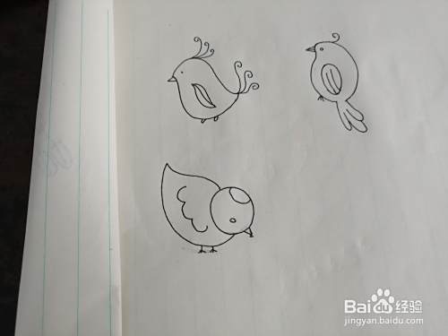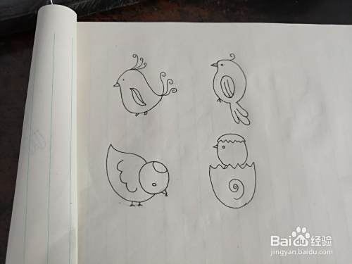 然后,再来画一只低头吃东西的小鸟,还有一只刚出蛋壳的小鸟,下面是效果图。
