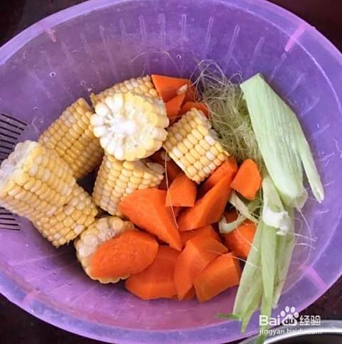 两个玉米和须,嫩衣,胡萝卜洗净,切好。
