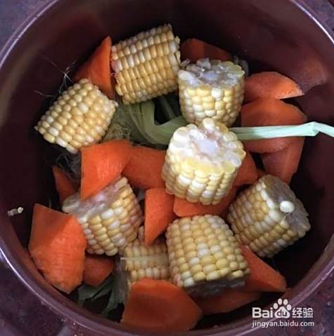 先把玉米衣和须放锅底,然后放玉米和胡萝卜。