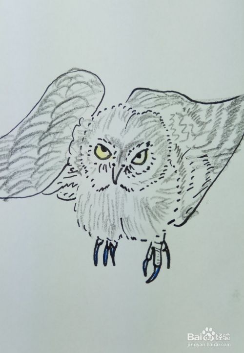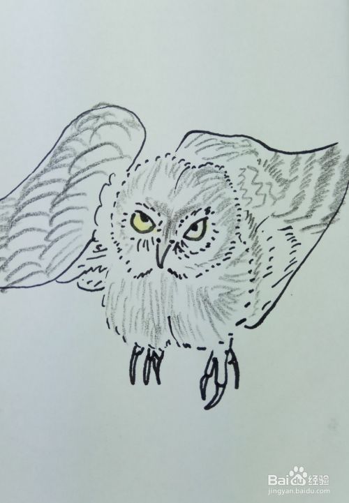 用线条和曲线画出猫头鹰的两个翅膀,它正在学习飞翔。