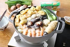 盖上盖子,煮开。可以看到鱼丸、油豆腐明显膨大,鲜虾完全变色。