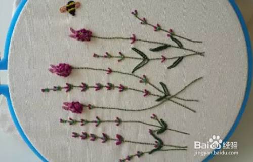 再用2股黄绿线直线绣一遍,然后用6股紫线法式花绣,中间的卷2次,边上的卷1次,把绣好的薰衣草花剪下,留一圈缝头,用挑绣法固定在薰衣草的茎上,2股线用轮廓绣和中央回针绣的法,再绣出几片叶子。