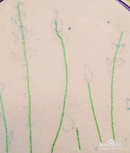 先画出薰衣草的结构轮廓,再分别用2股,3股,4股的绿线,用轮廓绣出薰衣草的茎,在4股线绣的茎上再用锁边轮廓绣一下,用针织绣法绣出薰衣草的叶子,在叶子的内侧用轮廓绣出两小枝花的茎。