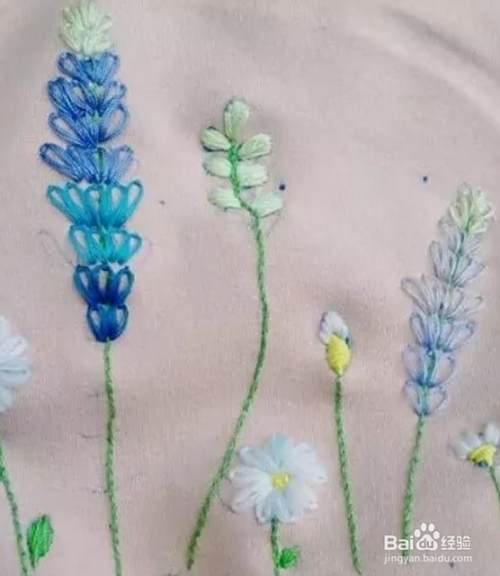 可以用不同的方法绣叶子,更加生动,按自己喜欢做出不同的造型,在薰衣草花的顶端,用1股粉线锁鏈绣出花瓣的轮廓,1股线用有经线的锁边绣出花瓣就好了。