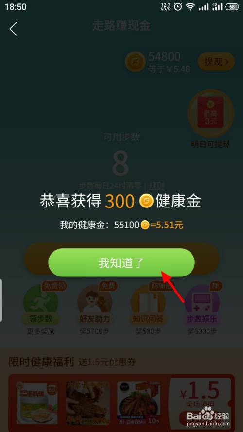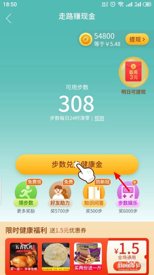 进入走路赚现金页面后,点击 步数兑换健康金;