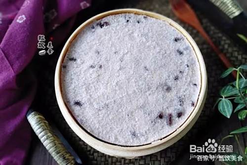 把布放在蒸抽屉里,把筛过的湿粉颗粒撒在蒸抽屉的底部,撒上煮熟的红豆,然后再铺一层湿粉和一层红豆。