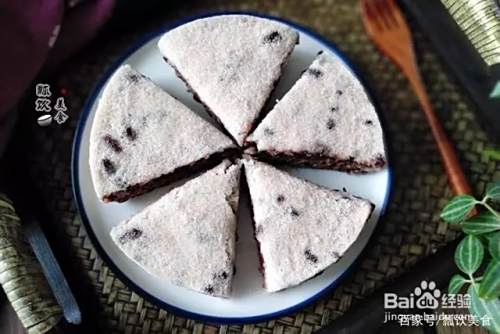 蒸好的红豆糕,取出,用牙签将粘连蒸屉边缘的部分轻轻划开。