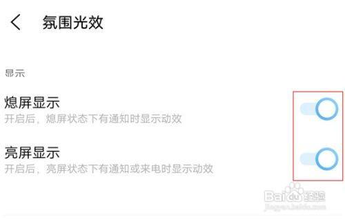 进入氛围光效界面,关闭熄屏显示、亮屏显示开关即可。