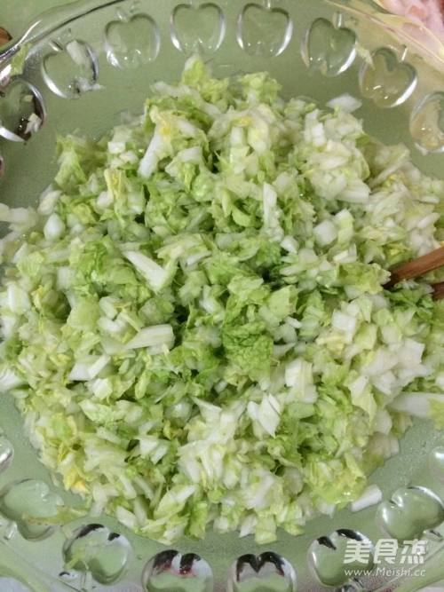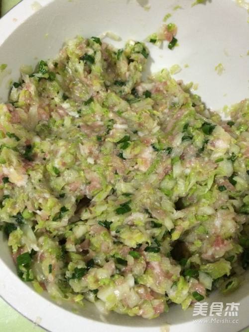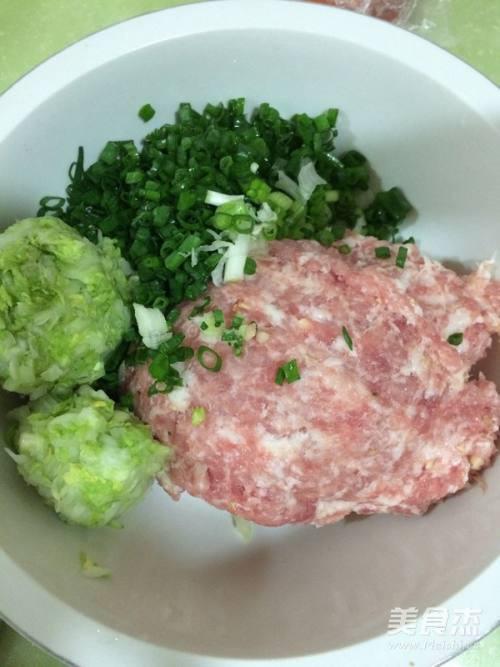 4将腌制好的白菜,用纱布包好挤出白菜的水分,放入肉沫中,再加入葱花,姜末,少许食盐,最后试试味道,因为开始白菜用盐腌制了的,再加入芝麻油,色拉油,拌匀。