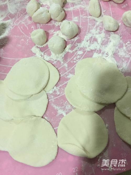 11先将面揉好后醒10分钟,然后搓成长条分成小剂子,用擀面杖像这样擀成圆形的饺子皮。