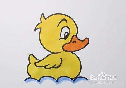 44、接下来我们用黄色涂小鸭子的全身,小鸭子的嘴巴涂成橙黄色,最后用蓝色涂水波,一只简单可爱的小鸭子就画好了。