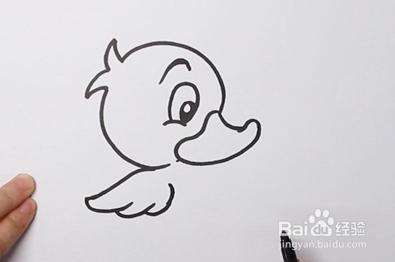 22、接着仔细的画上小鸭子侧面的一只眼睛,眼睛上面画上一条加粗的眉毛,再画上鸭子短短、小小的翅膀。