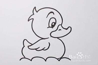 33、继续画好小鸭子的尾巴和身体,底部我们用波浪线绘出水波的形状,最后在嘴巴上点出鼻子就可以了。