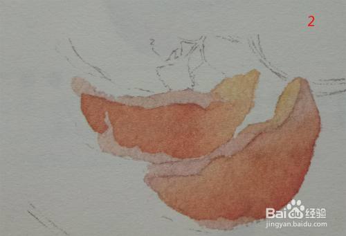 2:调和橙黄色加永固橙黄色,绘制煎饺的黄色部分。煎饺边缘调和枚红色加土黄色加少量酞青天蓝色绘制。如下图所示