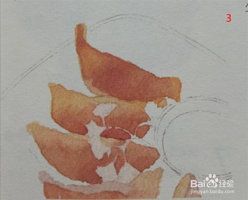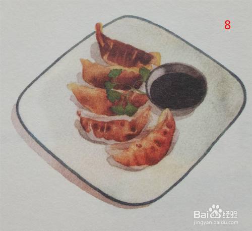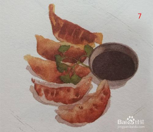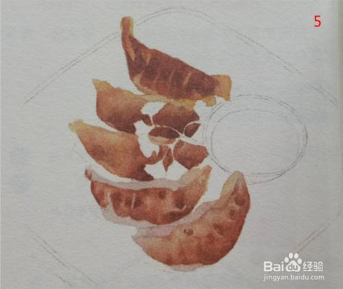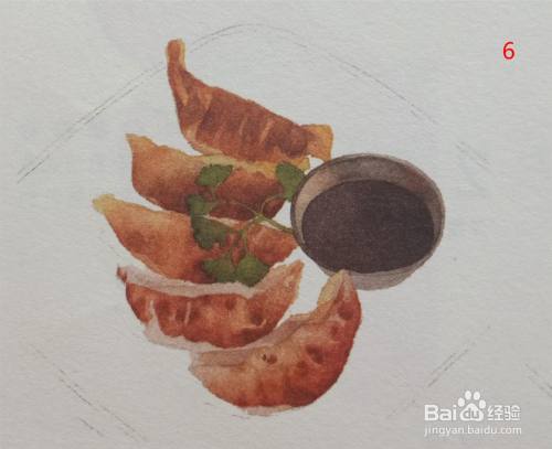 4:待颜色干透后,调和熟褐色加赭石色,叠涂煎饺表面的焦黄部分,使颜色变深。如下图所示