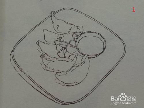 1:用铅笔绘制出煎饺和蘸料,再绘制出盘子的大小,最后简单地加上投影。如下图所示