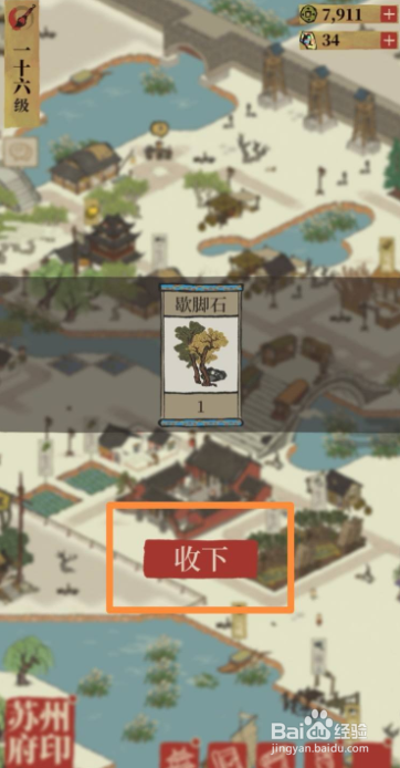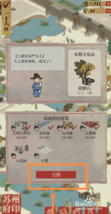 在江南百景图游戏中,在城市里找到严大人进行对话,选择需要交换的物品与交易中的歇脚石进行兑换,即可获得。