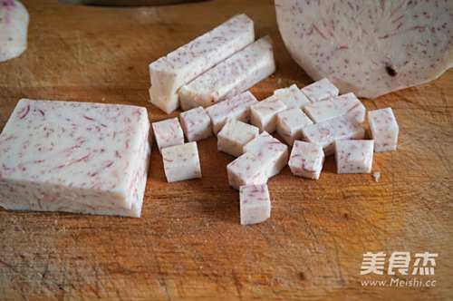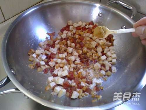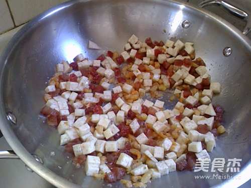 3热锅热油,先把腊肠、虾米炒出香味,然后加入芋头丁略炒一下