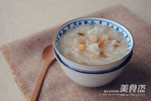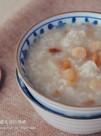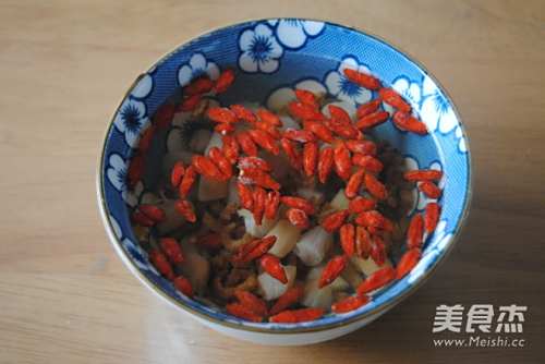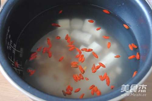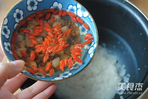 4淘洗两遍后把枸杞,虾米,瑶柱连同泡的水一起倒入锅内