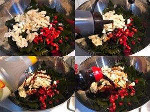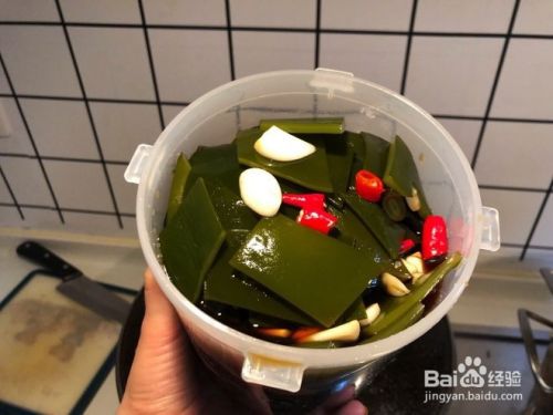 然后往海带里加入小米椒、蒜片、蚝油、米醋