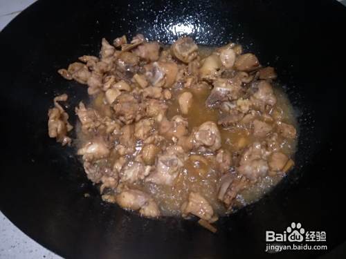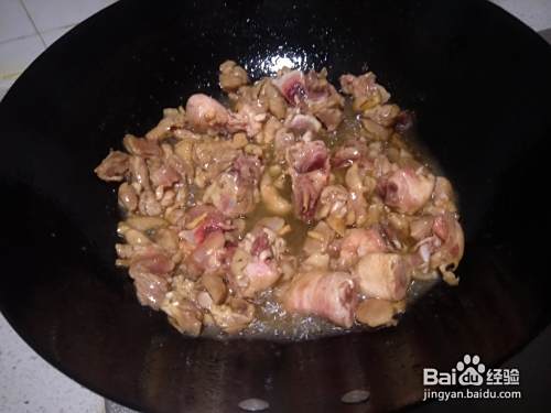 热锅下油,丢适量的花椒爆香,接着倒入鸡腿肉快速翻炒。鸡肉变色和微卷后加适量的酱油上色提味。