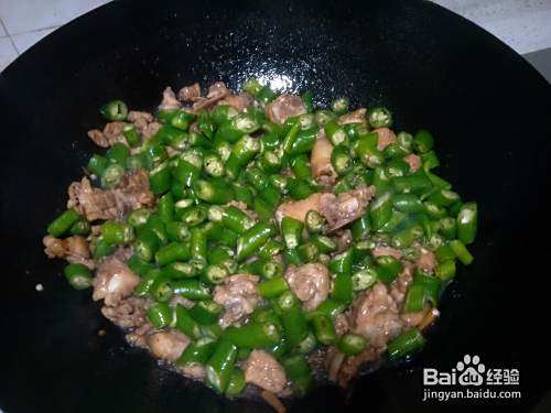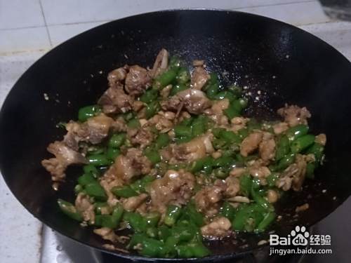 接着倒入尖椒粒翻炒均匀,等尖椒炒熟,加适量的食用盐就ok了。